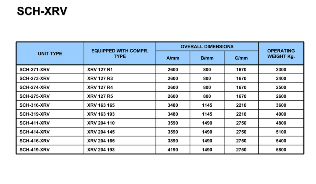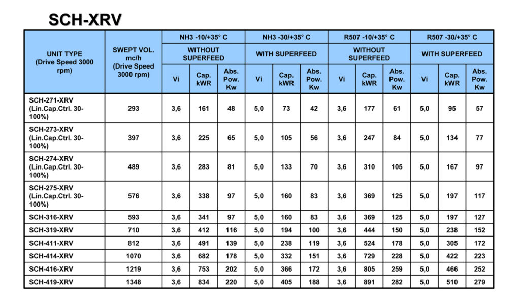 La serie SCH-XRV copre una gamma di capacità da 290 a 1350 mc/h con una velocità di 3000 rpm. Nel 90% delle applicazioni installate non necessità della pompa dell’olio.Tutti i modelli della gamma sono forniti di Vi variabile manualmente e funzionano con vari fluidi frigorigeni, tra cui R-717, R-507, R-134A, R-744 ed altri.